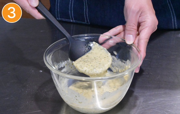 - ❷にホットケーキミックスを加えて混ぜる(ダマが少し残っても構わない)