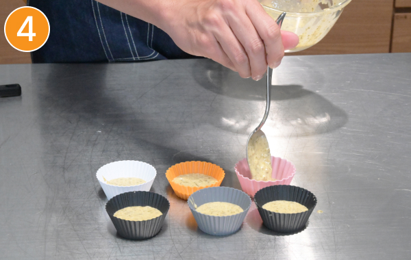 - ❸を耐熱カップの半分まで入れて軽くラップをかぶせ、500Wの電子レンジで1分30秒温める(竹串を刺して生地が付くときは、さらに10秒ずつ温める)